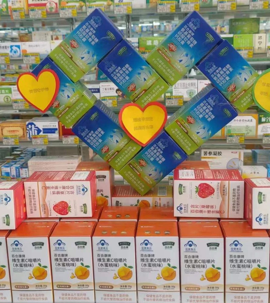 結(jié)合百合股份豐富的單品,店員們創(chuàng)造出了奔跑人偶、心形、百合康品牌名、VC等造型奇特的陳列作品。